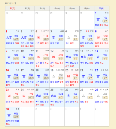 서비스를 이용해보니, 날짜마다 길일인지 아닌지를 한눈에 확인할 수 있어 편리했어요. 각 날짜를 클릭하면 해당 날짜가 좋은 이유와 피해야 할 점도 함께 제공되어 예랑이와 상의하는 데 큰 도움이 됐습니다.