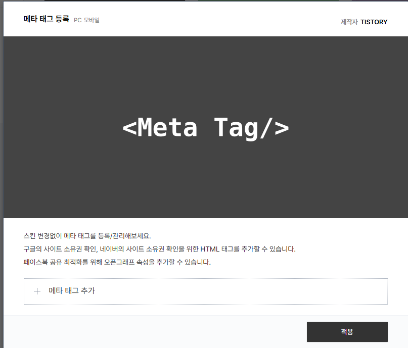 1️⃣ HTML 태그 방식을 선택하면 <meta> 태그가 제공돼요.