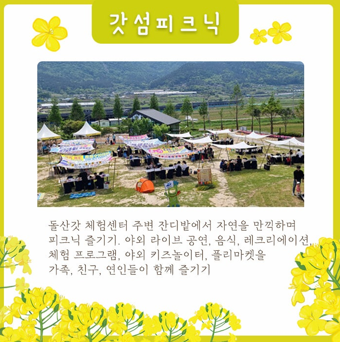 2025년 여수 돌산에서 열리는 갓섬피크닉은 여수의 특산물인 갓을 주제로 하는 피크닉 축제입니다.