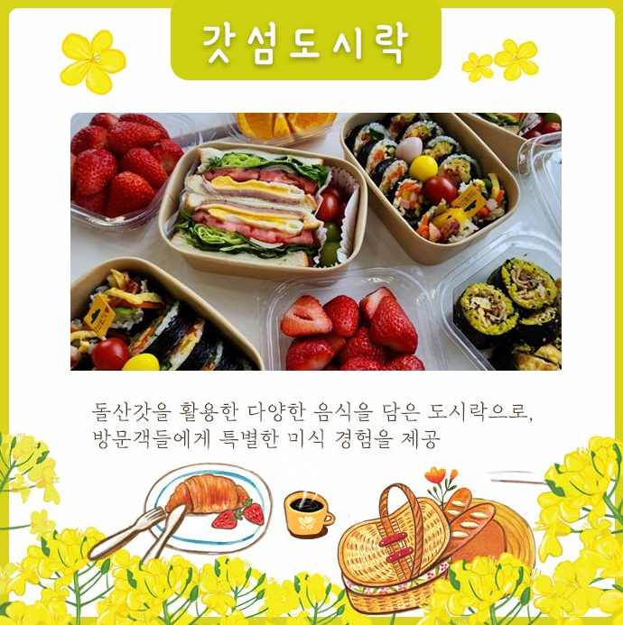 돌산에서만 즐길 수 있는 갓을 활용한 다양한 프로그램과 맛있는 음식, 그리고 다양한 즐길 거리가 준비되어 있어요.