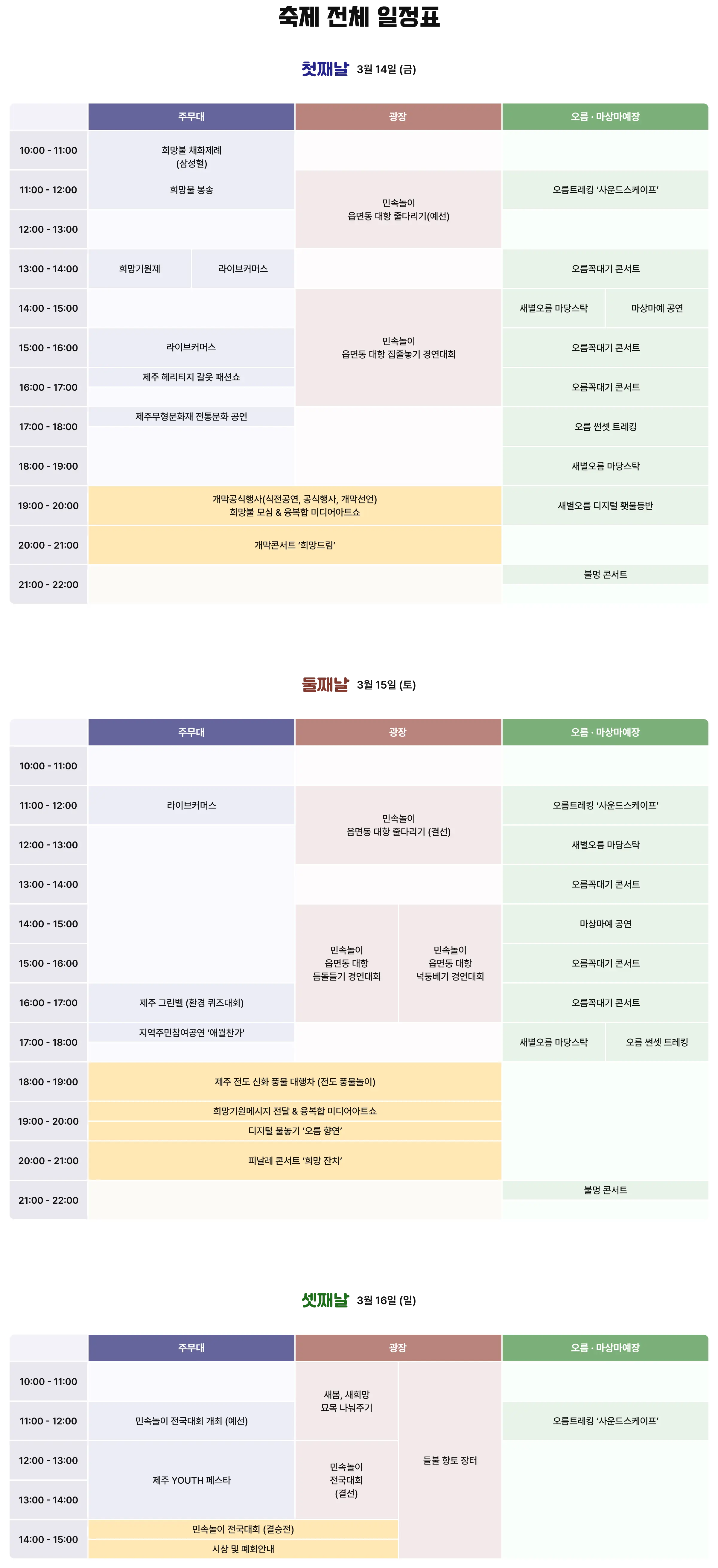 • 제주 전통 음식 만들기, 공예 체험 등 다양한 체험 프로그램이 마련됩니다. 관광객들은 제주 전통 문화를 직접 체험하며 즐길 수 있습니다.